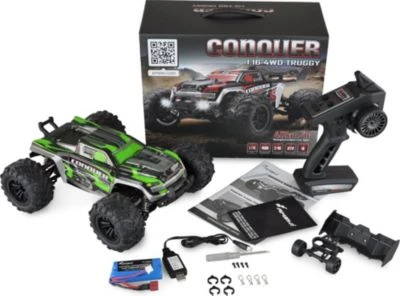 Im Maßstab 1:16 bringt der Conquer Truggy alles mit, das für großartige Action im Gelände benötigt wird: Metall-Kardanwellen und CVD-Antriebswellen vorne sorgen für direkte Kraftübertragung an die Räder. Dank 390er Racing-Brushed-Motor und Li-Ion Power sind Geschwindigkeiten von bis zu 40km/h möglich. Durch das Top-Deck aus Aluminium erhält das gesamte Modell mehr Festigkeit.