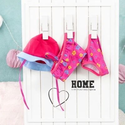 Sommer, Sonne, Strandmomente! Mit diesem bezaubernden 3-teiligen Puppenkleidungs-Set kommt ein tolles Outfit für Sommer- und Badevergnügen mit dem Puppenkind. Im passenden Farb-Mix begeistern hier ein 2-teiliger Bikini und ein bezaubernder Sonnenhut die kleinen Puppeneltern. Für ein leichtes An- und Ausziehen ist mit dem Klettverschluss gesorgt und neben dem reinen Spielevergnügen werden hier auch die feinmotorischen Fähigkeiten gefördert. Die Puppenkleidung ist für Puppen von 38 cm bis 42 cm geeignet.