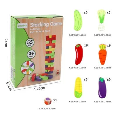 Außer Wackelturmspiel können die Kinder unser Brettspiel als Stapelspielzeug verwendet weden. Die Kinder können nach Ihren Wünschen die süße Gemüsebrette beliebig kombinieren, was die Fantasie der Kinder födert und beflügelt. Sie können zu allerlei Festen und Feiertagen sowie in alltäglichen Situationen zusammenspielen. Das Gesllschaftsspiel stützt die sozialen Aktivitäten und erhöht die Glücklichkeitsgefühl.