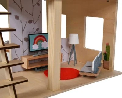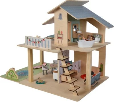 Das geräumige Puppenhaus bietet viel Platz für tolle Geschichten und kleine Abenteuer verteilt über zwei Etagen mit einem Schlafzimmer, Badezimmer, Küche und Wohnzimmer. Die obere Etage ist mit einer Treppe erreichbar. Das süße Puppenhaus hat sogar einen kleinen Außenbereich mit einer Liege zum Entspannen.