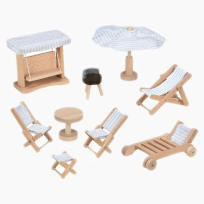 • Stylische Gartenmöbel in modernem Design für das Puppenhaus-Wohnzimmer. Natürlich aus Holz und passend zu allen goki und Madera Puppenhäusern.