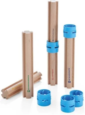 Mit dem Kullerbü-Ergänzungsset Hohe Säulen von HABA lässt sich die Kullerbü-Spielbahnen nach individuellen Wünschen erweitern. Die Hohen Säulen erhöhen den Spaßfaktor wortwörtlich. Dank ihnen baut man flexibel in die Höhe und verleiht den Kugeln so mehr Schwung. Mit den blauen Verbindungsmanschetten verbindet man je zwei Säulen miteinander zu einer hohen Säule. Ziffern und Mengenpunkte auf den Säulen dienen als Höhenangabe. Dabei gilt, je höher die Punkte bzw. die Ziffern, desto höher die Säule. Alle Kullerbü-Spielbahnen von HABA lassen sich mit spannenden Ergänzungssets wie diesem kombinieren. bringt extra viel Höhe ins Kullerbü-Spiel tolle Ergänzung für alle Kullerbü-Bahnen Teileanzahl: 5 Material: Kunststoff, Buche