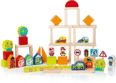 Mache die schönsten Gebäude mit diesem Holzblock-Set Das Set enthält 55 Holzblöcke in vielen Farben und Formen. In diesem Set findest du nicht nur die klassischen Formen, sondern auch detaillierte Figuren im Thema ‚Verkehr‘. Lerne spielerisch Farben, Formen, Gleichgewicht und Rollenspiel kennen. Lass deiner Fantasie freien Lauf und baue eine schöne Stadt und spiele Polizist.