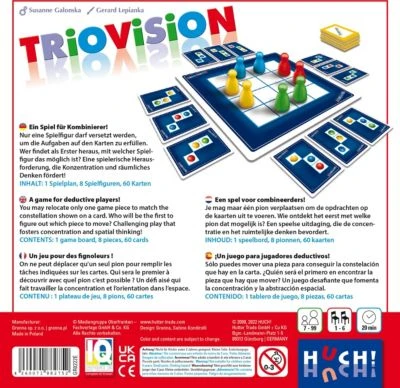 Im Spiel Triovision von HUCH! darf nur eine Spielfigur versetzt werden, um die Aufgabe auf der Karte zu erfüllen. Um herauszufinden, welche das ist, sollte man möglichst schnell sein. Wer hier den Überblick behält und schnell reagiert, hat gute Chancen auf den Sieg! Mit ganz viel Spaß werden dabei das räumliche Denken und die Konzentration gefördert.