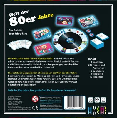 Die 80er Jahre haben Ihnen Spaß gemacht? Fanden Sie die Zeit schon damals spannend oder interessieren Sie sich erst seit Kurzem dafür? Beantworten Sie Fragen zu Mode, Sport, Film und Fernsehen, Musik, Literatur und Politik.1 Spielplan, 220 Fragen und Antworten, 5 Spielsteine, 4 Tipptafeln, 15 Tippchips