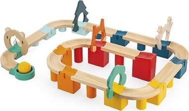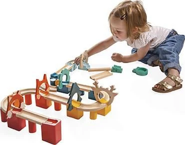 Für fröhliche und rasante Kugel-Manöver sorgt diese Kugelbahn aus Holz bestimmt. Das umfassende Set begeistert mit Pfeilern auf die – je nach Lust und Laune – die Schienen, Kurven und Tore montiert werden. Ist die Bahn aufgestellt, wird mit der Kugel die wilde Fahrt getestet. Angekommen? Das Glöckchen verrät es. Mit dem Set können entweder nach Anleitung Kugelbahn-Strecken gebaut, oder einfach frei konstruiert werden. Die aktive Gestaltung und die vielen Aufbaumöglichkeiten fördern ganz nebenbei die feinmotorischen Fertigkeiten, die räumliche Wahrnehmung und die Kreativität.