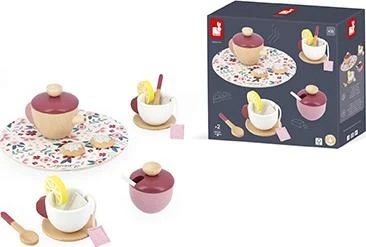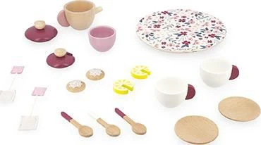 Dieses bezaubernde Teeservice „Twist“ aus dem Hause Janod sorgt garantiert für jede Menge lustigen Spielspaß! Das Service besteht aus einer Teekanne, einer Zuckerdose, zwei Tassen, zwei Untertassen, drei Holzlöffeln, zwei Filzteebeutel, zwei Zitronenscheiben, zwei Keksen und einem Holztablett. Das Set sieht dank des schönem Blümchendesigns besonders klasse aus und eignet sich somit auch als Deko im Kinderzimmer. Mit dem Teeset können Kinder elegante Teepartys mit ihren Geschwisterchen, Freund*innen, Puppen oder Kuscheltieren feiern!