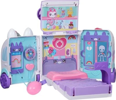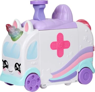 Der magische Krankenwagen ist wieder unterwegs zum nächsten Einsatz. Erkennbar macht er sich durch sein außergewöhnliches Design in Form eines Einhorns und die schicken Pastelltöne. Das Horn auf dem Dach dreht sich während der Fahrt, damit auch alle den Einsatzwagen gleich erkennen und Platz machen können. Die Kindi Kid Puppe freut sich schon, wenn endlich Hilfe naht. Umfangreich ausgestattet verfügt die Einhorn-Krankenstation über eine passende Liege, einen regenbogen-Herzmonitor, ein Blutdruckmessgerät und weiteres Zubehör. Kinder werden so zu richtigen Ärzt*innen und können verletzten Patient*innen so schnell helfen.