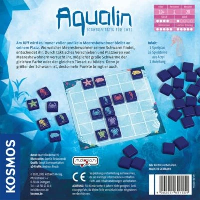 Bei dem spanenden „Aqualin“-Strategiespiel von Kosmos müssen die beiden Spieler sich ihre Züge gut überlegen! In einem Spielzug darf der Spieler sechs Steine auswählen und auf leeren Feldern platzieren. Auf diese Weise bilden die Spieler Schwärme von Meerestieren, die sie entweder nach Farbe oder Tierart ordnen können. Wer in sechsunddreißig Spielzügen den größten Schwarm bildet, gewinnt das Spiel!