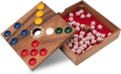 • SpielbeschreibungDie 60 Schweinchen werden gleichmäßig an die Mitspieler verteilt. In der 1. Runde hat jeder Spieler einen Wurf, in der 2. Runde 2 Würfe. Ab der dritten Runde kann jeder Spieler so oft würfeln, wie er möchte. Bei jedem Wurf muss ein Schweinchen auf das betreffende Zahlenfeld gesetzt werden. Trifft ein Spieler auf ein besetztes Zahlenfeld, muss er alle Schweinchen, die sich auf dem Spielfeld befinden, an sich nehmen und der nächste Spieler ist an der Reihe. Würfelt ein Spieler eine „6“, darf er ein Schweinchen durch das Loch in der Mitte des Spielfeldes werfen. Gewonnen hat, wer als Erster keine Schweinchen mehr hat.Pig Hole ist ein Würfel- und Gesellschaftsspiel für die ganze Familie!
