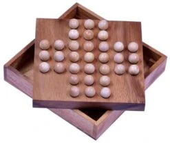 • SpielbeschreibungVerteilen Sie die Kugeln auf dem Spielfeld. Die mittlere Mulde bleibt frei. Überspringen Sie nun in waagerechter und senkrechter Richtung (nicht diagonal) jeweils eine Kugel und entfernen Sie diese. Zum Schluss sollte nur eine Kugel in der Mitte übrigbleiben.