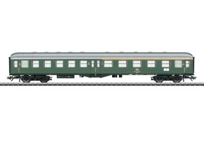 Vorbild: Reisezugwagen 1./2. Klasse der Deutschen Bundesbahn (DB) für sogenannte leichte Schnellzüge (LS). Bauart ABymb 411. Umgangssprachlich auch als „Mitteleinstiegswagen“ bekannt. Ausführung mit stirnseitig oben liegenden kleinen Schlussleuchten und Übersetzfenstern an den Einstiegen am Wagenende. Farbgebung in Chromoxidgrün. Betriebszustand um 1969. Modell: Serienmäßig eingebaute LED Innenbeleuchtung und Strom führende Kupplungen. Die Innenbeleuchtung funktioniert im Verbund mit dem Mitteleinstiegs-Steuerwagen und kann über einen Decoder im Steuerwagen digital ein- und ausgeschaltet werden. Stirnseitig rot transparente Schlusslicht-Einsätze an den Wagenenden. Typspezifisch gestalteter Unterboden. Drehgestelle Bauart Minden-Deutz schwer mit Doppelklotzbremse. Befahrbarer Mindestradius 360 mm. Für die Präsentation in einer Vitrine liegen WC-Fallrohre und Wendezugsteuerleitungen als separat ansteckbare Teile bei. Länge über Puffer 28,2 cm. Serienmäßig mit LED-Innenbeleuchtung.Trennbare, Strom führende Kupplungen.Innenbeleuchtung über Decoder im Steuerwagen digital schaltbar. Warnhinweis: Achtung: Nicht für Kinder unter 15 Jahren geeignet.nur für Erwachsene