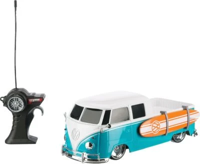 – den VW Bus „Surf“ im Maßstab 1:16! Das aus dem Hause Maisto stammende Modell wartet mit einer Höchstgeschwindigkeit von ca. 7,2 km/h auf. Die klassische Lackierung, die getönten Scheiben und das abnehmbare Surfbrett machen ihn zu einem besonders coolen Fahrzeug. Mit der einfach zu bedienenden Fernsteuerung kann er sich bis zu 20 Meter weit entfernen.