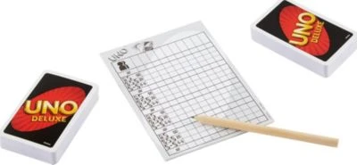UNO Deluxe in der Geschenkbox für alle, die gern UNO spielen: Mit Wertungsblock und Stift in einer exklusiven Verpackung ist Uno Deluxe das ideale Geschenk! Für 2-10 Spieler.