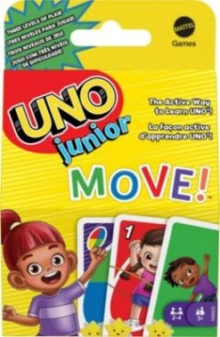 Nach dem beliebten Klassiker UNO kommt hier eine Sonderausgabe für alle Fans von tollen Bewegungselementen im Spiel. Das Kartenspiel „UNO Junior Move“ von Mattel begeistert mit besonderen Aktionsspielkarten, die dazu auffordern in Bewegung zu kommen. Wird eine Karte mit Sternensymbol ausgespielt heißt es hüpfen, springen oder klatschen.