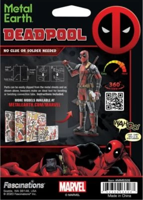 Besonders frech und gleichzeitig cool – hier kommt Marvels Deadpool als lasergeschnittener, detailgetreuer 3D-Konstruktionsbausatz von Metal Earth! Dabei werden einzelne Teile aus den Metallplatten herausgetrennt und, ohne Klebstoff benutzen zu müssen, mithilfe der Anleitung zusammengesetzt. Er eignet sich für fortgeschrittene Bastler, die ein wenig Vorerfahrung mit Puzzle-Bausätzen haben.