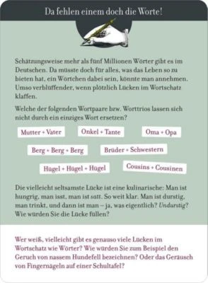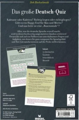 Kaktusse oder Kakteen? Richtig liegen oder richtigliegen? Gibt es ein Happy End für Max und Moritz? Und was bitte ist eine „Busensünde“? Alles, was die deutsche Sprache reizvoll macht, wird in dieser hochwertig ausgestatteten Quizbox zelebriert! Sprach- und Literaturliebhaber*innen dürfen sich auf ein Füllhorn aus spannenden Fragen und gleichermaßen lehrreichen wie erhellenden Antworten freuen.