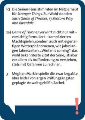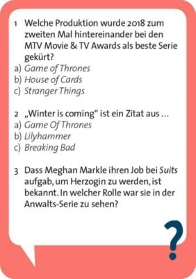 Serienliebhaber*innen aufgepasst! Hier kommt das perfekte Spiel für alle, die gerne einmal auf gängigen Streamingplattformen abtauchen. Dieses Game ist schnell gelernt. Insgesamt fünfzig Karten mit hundertfünfzig Fragen befinden sich in der Schachtel. Aufgepasst, denn am Ende werden die größten Junkies enttarnt.