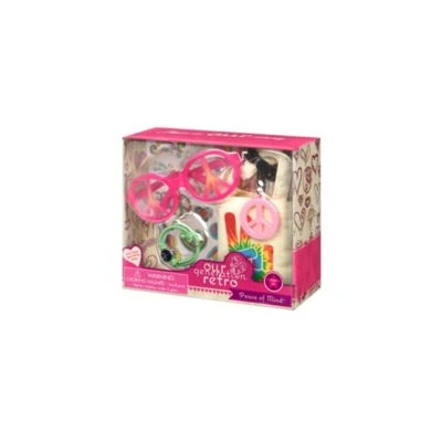 Peace, Love and happiness. Das Our Generation Love & Peace Accessoires Set mit Jutebeutel versetzt deine Puppe in die Hippie-Zeit. Die rosa Halskette, das grüne Armband und sogar die pinke Sonnenbrille haben alle ein Peace-Zeichen. Mit dem Stickerbogen kannst du mit deiner Puppe alle in die Flower Power Zeit beamen!