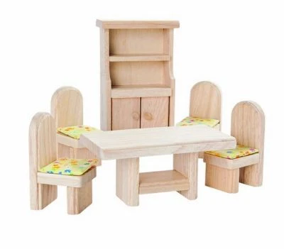Das Puppenmöbelset Esszimmer Classic besteht aus einem Tisch, vier Stühlen mit Sitzkissen und einer Anrichte. Diese Puppenhausmöbelset passt zu allen Puppenhäusern von PlanToys.
