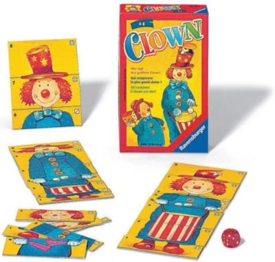 Hier trommeln sechs lustige Clowns! Die Würfelpunkte geben an, ob sie kurze Beine, einen dicken Bauch oder einen großen Kopf haben. Karte für Karte wachsen die Clowns hinauf bis zum Hut.