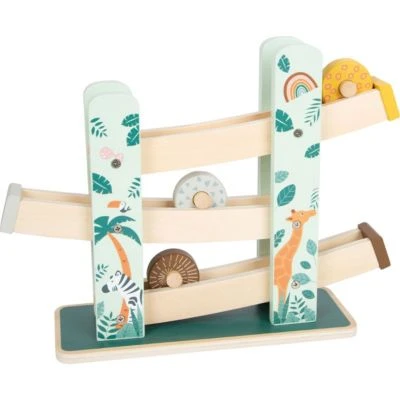 Mit Schwung durch die Wildnis! Auf dieser Kugelbahn aus Holz im angesagten „Safari“-Look rasen drei verschieden farbige und mit Mustern verzierte Holzräder die drei Rampen hinunter. Die Abfahrt ist mit Safari-Tieren und trendigen Blätter-Motiven detailreich verziert. Ausdauernder Spielspaß vorprogrammiert! Ein echter Hingucker und Anziehungspunkt für jedes Kinderzimmer! Besonders standfest durch breiten Standfuß!