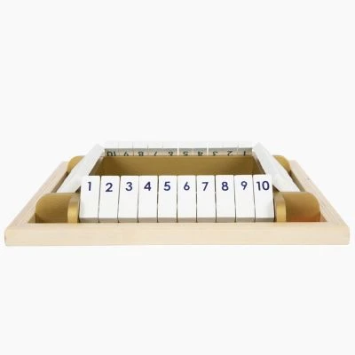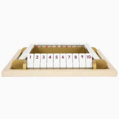 Das Klappenspiel im modernen Look ist ein großartiger Würfelspielspaß für die ganze Familie – und dabei gut geeignet für Vorschüler und Schulanfänger, um spielerisch Zahlen, Würfelaugen und das Rechnen zu erlernen. Fördert die Konzentration und trainiert das Kopfrechnen! Das Ziel des Spieles ist es, möglichst viele oder alle Ziffern auf dem Spielbrett zuzuklappen. Es wird immer mit beiden Würfeln gespielt. Die Augenzahl beider Würfel wird addiert. Wenn Sie, zum Beispiel 6 und 3 würfeln, haben Sie fünf Möglichkeiten, die Ziffern zuzuklappen : 9, 8 und 1, 7 und 2, 6 und 3, 5 und 4. Der Spieler kann so lange weiterwürfeln, bis keine Möglichkeit mehr besteht. Der Sieger ist, wer die niedrigste Summe erreicht. Shut the box enthält : 1 Spielbrett, 2 Würfel und 1 Anleitung.