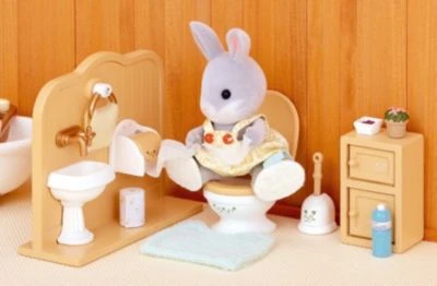 Mit diesem Toiletten-Set wird das Badezimmer in jedem Haus zu einem wirklich stilvollen stillen Örtchen. Die Türen des Schränkchens, die Toilette, der Toilettenpapierhalter und sogar die gemütlichen Badeschlappen sind geschmückt mit kleinen Blümchenverzierungen. Die hübsche Topfblume sieht in dieser Umgebung besonders passend aus. Neben dem Waschbecken hängt an einem klassischen Halter ein weiches Handtuch. Dank des Detailreichtums des Sets können Kinder sich noch besser in ihre Spielwelt hineinversetzen.
