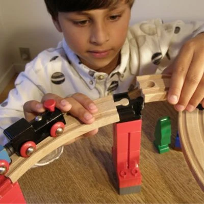 Kleine und große Kinder in allen Altern können miteinander Holzeisenbahnen bauen. Ein fantastisches Spielzeug, mit dem die ganze Familie spielen kann.