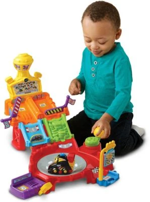 Super viel Spaß bietet diese kunterbunte „Tut Tut Baby Flitzer“ Rennpiste von VTECH, die mit fünf Besonderheiten und Attraktionen begeistern kann! Dazu gehören bewegliche Schraubenschlüssel, ein toller Aufzug sowie ein Karussell. Im Spielset enthalten ist auch ein Flitzer Rennauto mit lustigen Geräuscheffekten. Kinder können sich auf drei gesungene Lieder und sechs Melodien freuen.