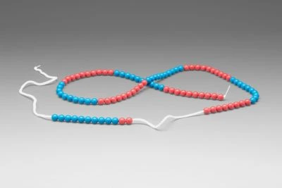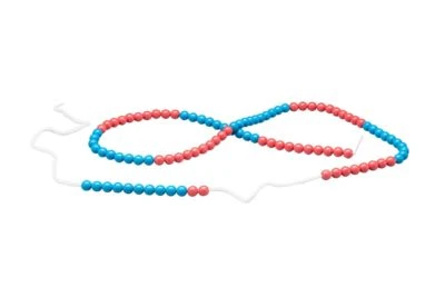 Rechenkette (ca. 150 cm) mit 100 Kugeln, die im 10er- Schritt auf einer reißfesten, dehnbaren Schnur aufgefädelt sind. Die Kugeln sind aus RE-Plastic® und haben einen Durchmesser von 1 cm. Beim Ziehen der Schnur wird die leichte Kugelarretierung aufgehoben und alle Perlen rutschen wieder aneinander.